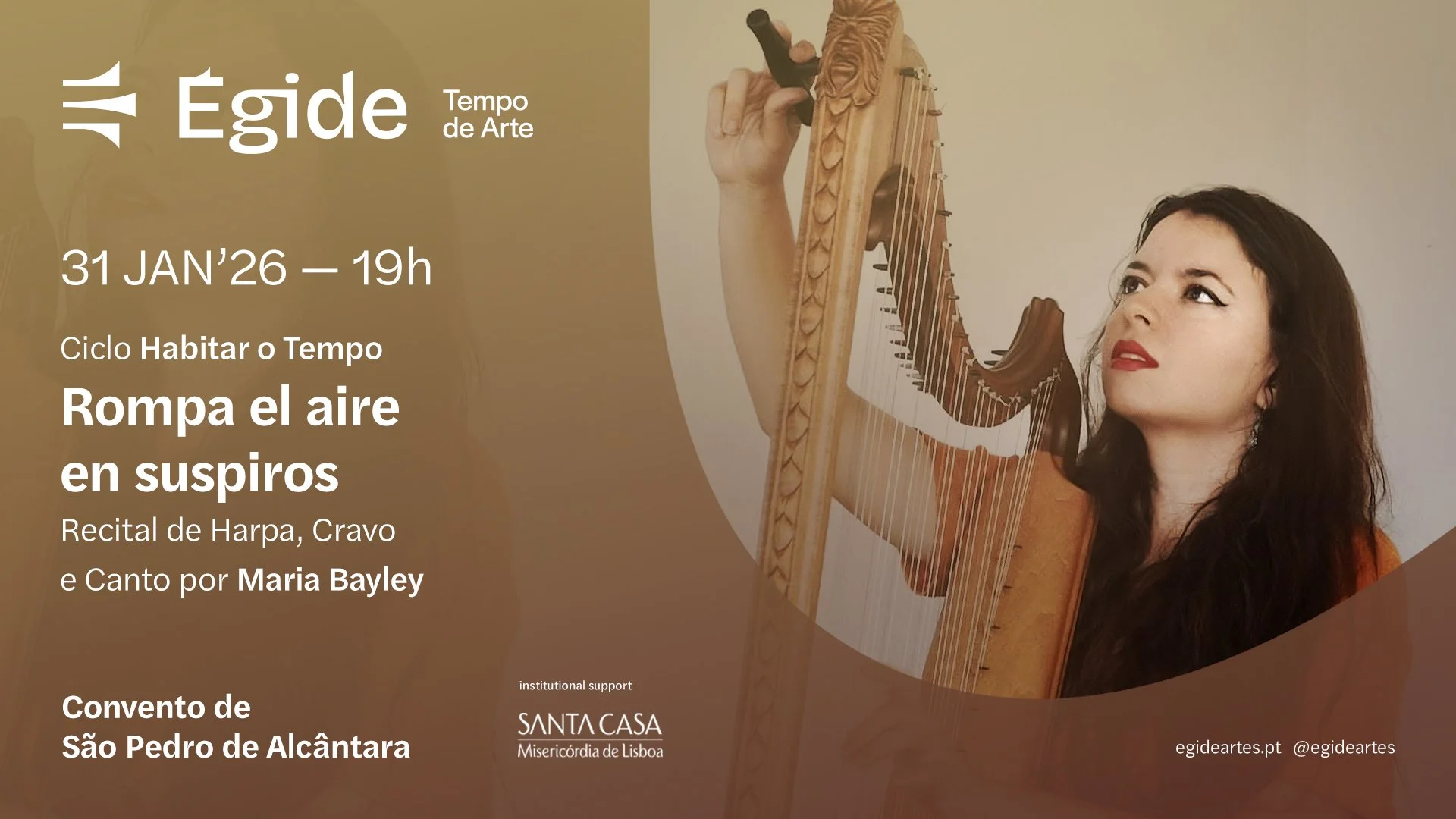 A Égide - Associação Portuguesa das Artes, inaugura o ciclo de programação de 2026 no Convento de São Pedro de Alcântara, em Lisboa, no próximo sábado, 31 de janeiro, pelas 19h00, com o Recital de Harpa, Cravo e Canto, conduzido por Maria Bayley. Rompa el aire en suspiros é o nome do primeiro concerto deste ano neste local emblemático da capital, inserido no ciclo Habitar o Tempo e no subciclo Transtempo, da Égide.